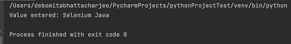 輸出顯示訊息 - 程序以退出程式碼 0 結束,這意味著上述 Python 程式碼成功執行。此外,在編輯框中輸入的值(從 get_attribute 方法獲得) - Selenium Java 已列印到控制檯。