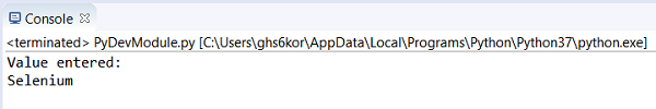 from selenium import webdriver #set geckodriver.exe path driver = webdriver.Firefox(executable_path="C:\geckodriver.exe") driver.implicitly_wait(0.5) driver.get("https://tutorialspoint.tw/index.htm") #identify element with tagname l = driver.find_element_by_tag_name("input") l.send_keys("Selenium") #obtain value obtained print("Value entered: ") print(l.get_attribute('value')) driver.quit()
