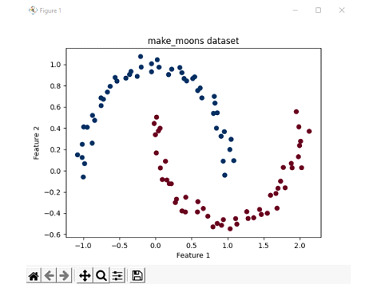 考慮一個案例不線性可分的情況。在這種情況下,我們使用 scikit-learn 庫中提供的 make_moons 資料集。make_moons 資料集是展示 2 個或多個類別不線性可分情況的好方法。因此,此示例用於描述非線性可分情況。