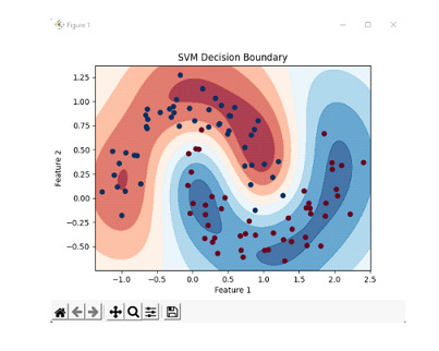 我們透過建立 100 個樣本(噪聲級別為 0.15,隨機種子為 42)生成資料集,並建立一個 SVM 分類器,並在資料集上訓練分類器。然後,我們定義一組點來表示特徵和標籤。然後,我們計算這些點的決策函式值,並將其重新整形以匹配網格的維度。然後,我們建立決策邊界的等高線圖,其中決策函式值決定區域的顏色。我們還繪製原始資料點,不同顏色代表不同類別。