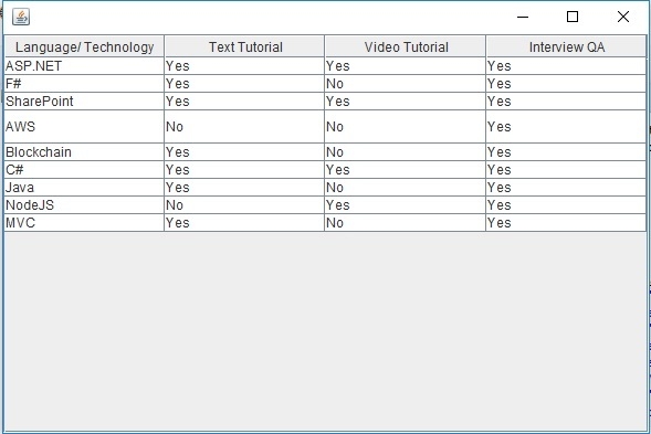 tableModel.addRow(new Object[] { "Blockchain", "Yes", "No", "Yes"});