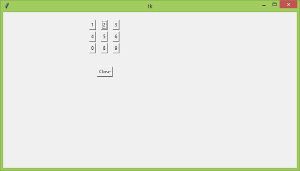 #Import the required libraries from tkinter import * import webbrowser #Create an instance of tkinter frame win = Tk() win.geometry("750x400") #Define function for different operations def close(): win.destroy() #Create a Label widget text=Label(win, text="", font=('Helvetica bold ',25)) text.place(x= 110, y= 50,) #Create Button widgets b1=Button(win, text= "1") b1.place(x=220, y=20) b2=Button(win, text= "2") b2.place(x=250, y=20) b3=Button(win, text= "3") b3.place(x=280, y=20) b4=Button(win, text= "4") b4.place(x=220, y=50) b5=Button(win, text= "5") b5.place(x=250, y=50) b6=Button(win, text= "6") b6.place(x=280, y=50) b7=Button(win, text= "7") b7.place(x=280, y=80) b8=Button(win, text= "8") b8.place(x=250, y=80) b9=Button(win, text= "9") b9.place(x=280, y=80) b0=Button(win, text= "0") b0.place(x=220, y=80) #Set the focus on button b1 b2.focus_set() b2=Button(win, text= "Close", command= close) b2.place(x=240,y= 140) win.mainloop()
