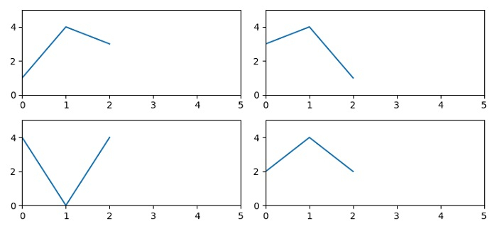 from matplotlib import pyplot as plt plt.rcParams["figure.figsize"] = [7.50, 3.50] plt.rcParams["figure.autolayout"] = True ax1 = plt.subplot(2, 2, 1) ax1.set_xlim(left=0, right=5) ax1.set_ylim(bottom=0, top=5) ax1.plot([1, 4, 3]) ax2 = plt.subplot(2, 2, 2, sharey=ax1, sharex=ax1) ax2.plot([3, 4, 1]) ax3 = plt.subplot(2, 2, 4, sharey=ax1, sharex=ax1) ax3.plot([2, 4, 2]) ax4 = plt.subplot(2, 2, 3, sharey=ax1, sharex=ax1) ax4.plot([4, 0, 4]) plt.show()
