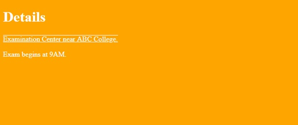 <!DOCTYPE html> <html> <head> <style> .demo { text-decoration: overline underline; } </style> </head> <body style="background-color: orange;color: white;"> <h1>Details</h1> <p class="demo">Examination Center near ABC College.</p> <p class="demo2">Exam begins at 9AM.</p> </body> </html>
