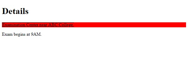 <!DOCTYPE html> <html> <head> <style> .demo { text-decoration: overline underline; background-color: red; } </style> </head> <body> <h1>Details</h1> <p class="demo">Examination Center near ABC College.</p> <p class="demo2">Exam begins at 9AM.</p> </body> </html>