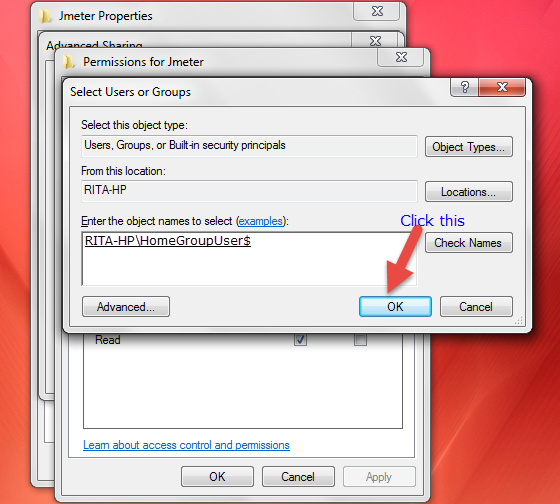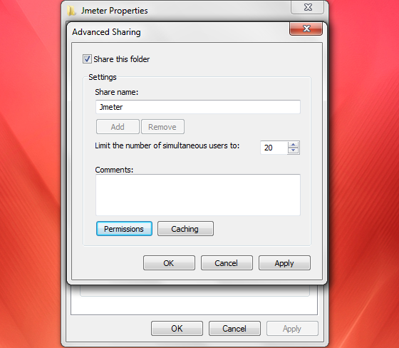 接下來,將開啟 Jmeter 資料夾屬性對話方塊,在此處也單擊“確定”以與家庭組中連線的 PC 斜向共享資料夾。