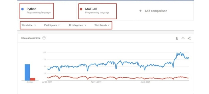 下圖顯示了Python程式語言多年來的普及程度。這就是為什麼學習它是有益的。但這並不意味著Matlab沒有用。除此之外,您應該瞭解自己的主要目標以及為什麼要學習這些語言中的任何一種或兩種。