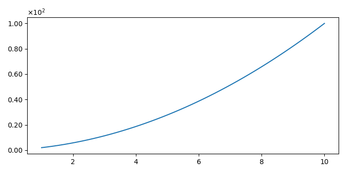 import numpy as np from matplotlib.ticker import ScalarFormatter from matplotlib import pyplot as plt plt.rcParams["figure.figsize"] = [7.00, 3.50] plt.rcParams["figure.autolayout"] = True class ScalarFormatterClass(ScalarFormatter): def _set_format(self): self.format = "%1.2f" x = np.linspace(1, 10) y = np.linspace(2,10) y = x * y plt.plot(x, y) ax = plt.gca() yScalarFormatter = ScalarFormatterClass(useMathText=True) yScalarFormatter.set_powerlimits((0,0)) ax.yaxis.set_major_formatter(yScalarFormatter) plt.show()