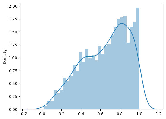import seaborn as sns random_num = np.random.power(2.0, size=1000) sns.distplot(random_num, hist=True, kde=True, bins=30)