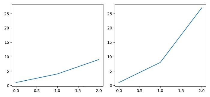 from matplotlib import pyplot as plt plt.rcParams["figure.figsize"] = [7.50, 3.50] plt.rcParams["figure.autolayout"] = True ax1 = plt.subplot(1, 2, 1) ax1.plot([1, 4, 9]) ax2 = plt.subplot(1, 2, 2, sharey=ax1) ax2.plot([1, 8, 27]) plt.show()