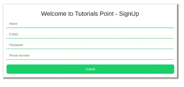 <!DOCTYPE html> <html> <head> <title> Signup Form</title> <link rel="stylesheet" href= "https://maxcdn.bootstrapcdn.com/bootstrap/3.3.7/css/bootstrap.min.css" integrity= "sha384-BVYiiSIFeK1dGmJRAkycuHAHRg32OmUcww7on3RYdg4Va+PmSTsz/K68vbdEjh4u" crossorigin="anonymous"> <link rel="stylesheet" type="text/css" href="style.css"> </head> <body> <br> <br> <br> <div class="container" > <div class="row"> </div> <div class="main"> <form action="/sign_up" method="post"> <h1>Welcome to Tutorials Point - SignUp</h1> <input class="box" type="text" name="name" id="name" placeholder="Name" required /><br> <input class="box" type="email" name="email" id="email" placeholder="E-Mail " required /><br> <input class="box" type="password" name="password" id="password" placeholder="Password " required/><br> <input class="box" type="text" name="phone" id="phone" placeholder="Phone Number " required/><br> <br> <input type="submit" id="submitDetails" name="submitDetails" class="registerbtn" value="Submit" /> <br> </form> </div> <div class=""> </div> </div> </div> </body> </html>