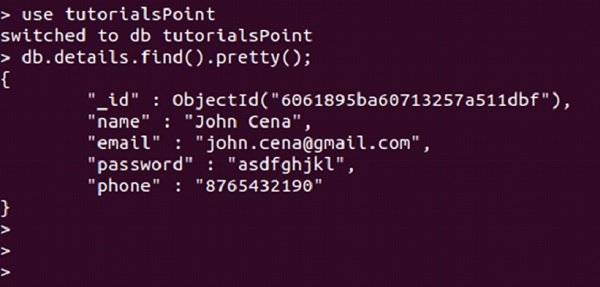 C:\Users\tutorialsPoint\> node app.js server listening at port 3000 (node:73542) DeprecationWarning: current URL string parser is deprecated, and will be removed in a future version. To use the new parser, pass option { useNewUrlParser: true } to MongoClient.connect. (node:73542) [MONGODB DRIVER] Warning: Current Server Discovery and Monitoring engine is deprecated, and will be removed in a future version. To use the new Server Discover and Monitoring engine, pass option { useUnifiedTopology: true } to the MongoClient constructor. connection succeeded