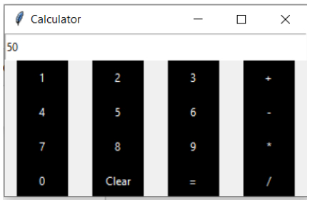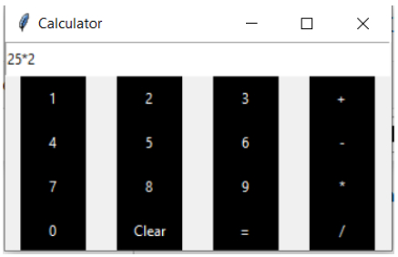 # importing everyting from tkinter from tkinter import * # expression to access among all the functions expression = "" # functions def input_number(number, equation): # accessing the global expression variable global expression # concatenation of string expression = expression + str(number) equation.set(expression) def clear_input_field(equation): global expression expression = "" # setting empty string in the input field equation.set("Enter the expression") def evaluate(equation): global expression # trying to evaluate the expression try: result = str(eval(expression)) # showing the result in the input field equation.set(result) # setting expression to empty string expression = "" except: # some error occured # showing it to the user equation.set("Enter a valid expression") expression = "" # creating the GUI def main(): # main window window = Tk() # setting the title of GUI window window.title("Calculator") # set the configuration of GUI window window.geometry("325x175") # varible class instantiation equation = StringVar() # input field for the expression input_field = Entry(window, textvariable=equation) input_field.place(height=100) # we are using grid position # for the arrangement of the widgets input_field.grid(columnspan=4, ipadx=100, ipady=5) # settin the placeholder message for users equation.set("Enter the expression") # creating buttons and placing them at respective positions _1 = Button(window, text='1', fg='white', bg='black', bd=0, command=lambda: input_number(1, equation), height=2, width=7) _1.grid(row=2, column=0) _2 = Button(window, text='2', fg='white', bg='black', bd=0, command=lambda: input_number(2, equation), height=2, width=7) _2.grid(row=2, column=1) _3 = Button(window, text='3', fg='white', bg='black', bd=0, command=lambda: input_number(3, equation), height=2, width=7) _3.grid(row=2, column=2) _4 = Button(window, text='4', fg='white', bg='black', bd=0, command=lambda: input_number(4, equation), height=2, width=7) _4.grid(row=3, column=0) _5 = Button(window, text='5', fg='white', bg='black', bd=0, command=lambda: input_number(5, equation), height=2, width=7) _5.grid(row=3, column=1) _6 = Button(window, text='6', fg='white', bg='black', bd=0, command=lambda: input_number(6, equation), height=2, width=7) _6.grid(row=3, column=2) _7 = Button(window, text='7', fg='white', bg='black', bd=0, command=lambda: input_number(7, equation), height=2, width=7) _7.grid(row=4, column=0) _8 = Button(window, text='8', fg='white', bg='black', bd=0, command=lambda: input_number(8, equation), height=2, width=7) _8.grid(row=4, column=1) _9 = Button(window, text='9', fg='white', bg='black', bd=0, command=lambda: input_number(9, equation), height=2, width=7) _9.grid(row=4, column=2) _0 = Button(window, text='0', fg='white', bg='black', bd=0, command=lambda: input_number(0, equation), height=2, width=7) _0.grid(row=5, column=0) plus = Button(window, text='+', fg='white', bg='black', bd=0, command=lambda: input_number('+', equation), height=2, width=7) plus.grid(row=2, column=3) minus = Button(window, text='-', fg='white', bg='black', bd=0, command=lambda: input_number('-', equation), height=2, width=7) minus.grid(row=3, column=3) multiply = Button(window, text='*', fg='white', bg='black', bd=0, command=lambda: input_number('*', equation), height=2, width=7) multiply.grid(row=4, column=3) divide = Button(window, text='/', fg='white', bg='black', bd=0, command=lambda: input_number('/', equation), height=2, width=7) divide.grid(row=5, column=3) equal = Button(window, text='=', fg='white', bg='black', bd=0, command=lambda: evaluate(equation), height=2, width=7) equal.grid(row=5, column=2) clear = Button(window, text='Clear', fg='white', bg='black', bd=0, command=lambda: clear_input_field(equation), height=2, width=7) clear.grid(row=5, column=1) # showing the GUI window.mainloop() # start of the program if __name__ == '__main__': main()