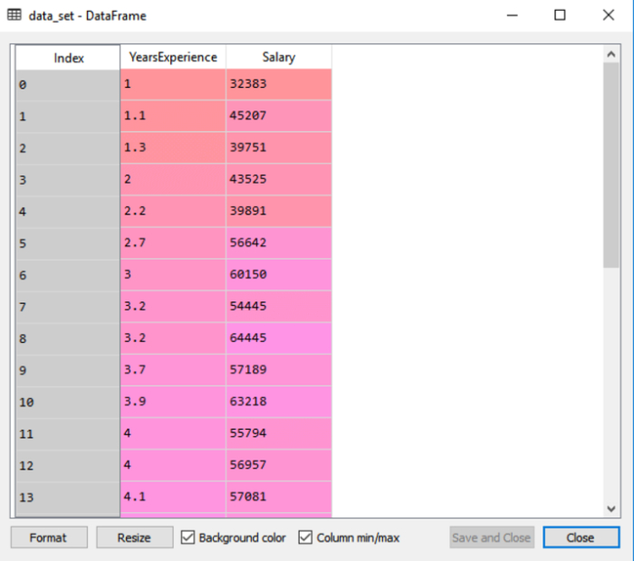 輸出中顯示了資料集,其中包括兩個變數經驗和薪資。