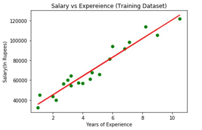 mtplt.scatter(a_train, b_train, color="green") mtplt.plot(a_train, a_pred, color="red") mtplt.title("Salary vs Experience (Training Dataset)") mtplt.xlabel("Years of Experience") mtplt.ylabel("Salary(In Rupees)") mtplt.show()
