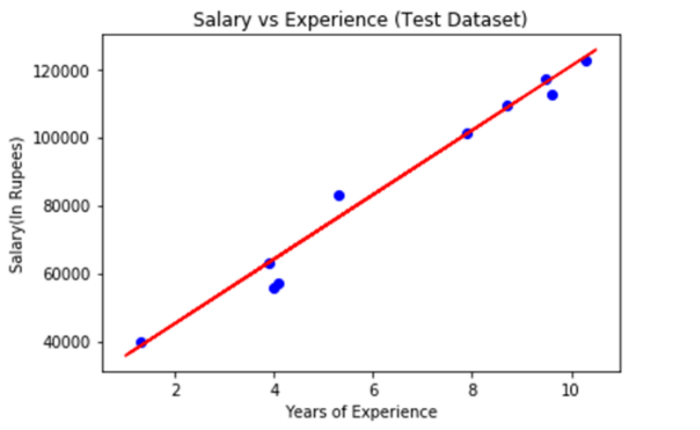 mtplt.scatter(a_train, b_train, color="blue") mtplt.plot(a_train, a_pred, color="red") mtplt.title("Salary vs Experience (Test Dataset)") mtplt.xlabel("Years of Experience") mtplt.ylabel("Salary(In Rupees)") mtplt.show()