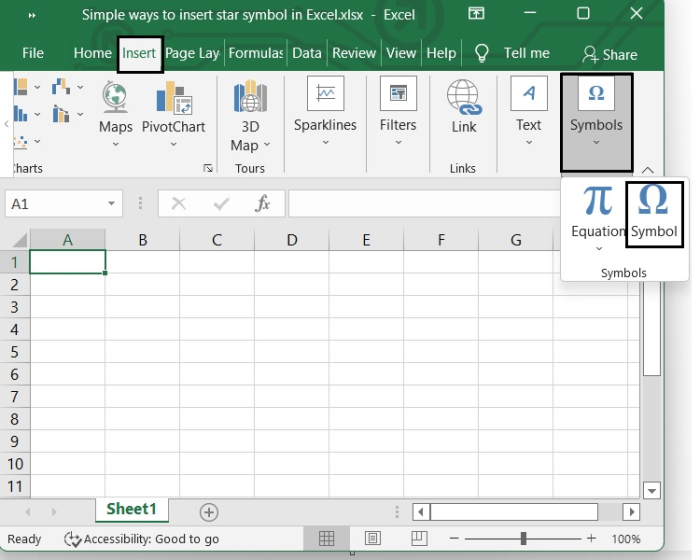 我們可以使用 Excel 工作表的符號選單新增星號符號。要新增星號符號,請按照以下步驟操作: