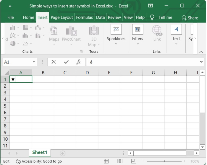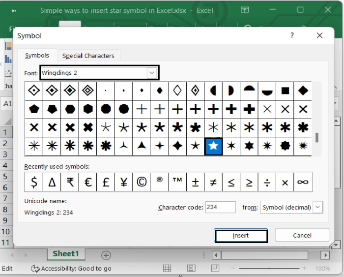 然後單擊“插入”按鈕以在 Excel 工作表中插入星號符號。