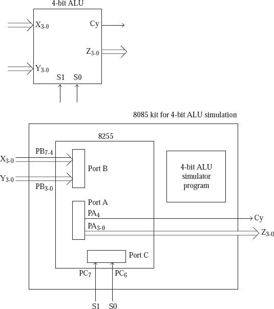 對於算術邏輯單元的模擬,所有的終端輸入和輸出均由 8255 的埠提供,如下圖所示。