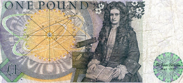 艾薩克·牛頓爵士,見於英鎊紙幣背面