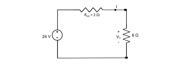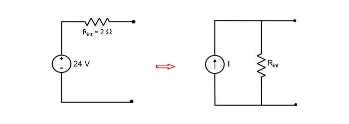 $$\mathrm{\mathit{I}=\frac{\mathit{V}}{\mathit{R}_{int}}=\frac{24}{2}=12\:A}$$