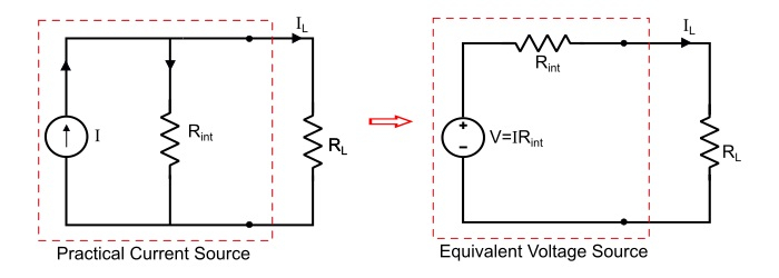 考慮一個恆定電流為 I 安培,並聯內阻為 Rint 的實際電流源,它可以轉換為等效電壓源,如下所示。