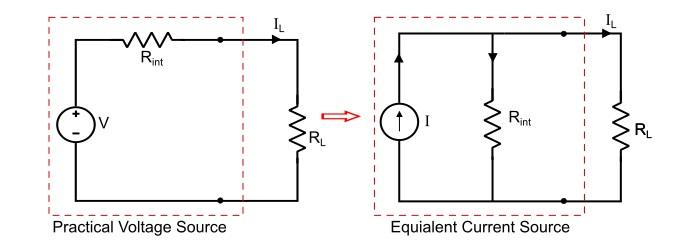 因此,一個恆定電壓為 V,內阻為 Rint 的實際電壓源等效於一個電流為 I = V/Rint,內阻為 Rint 的電流源,該內阻與電流源並聯。