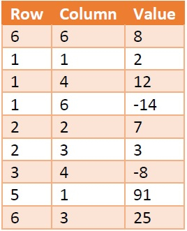 這裡,第一列儲存行號,第二列儲存列號。第三列儲存M[row, col]中存在的資料。此表的每一行都稱為三元組,因為有三個引數。第一個三元組儲存矩陣的大小資訊。Row = 6和Column = 6表示矩陣M是6 x 6矩陣。value欄位表示陣列中存在的非零元素的數量。