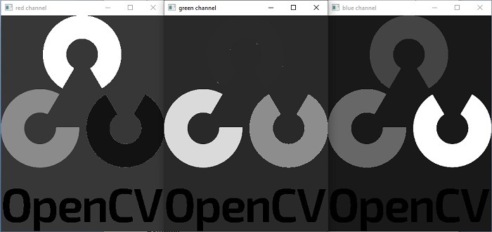 彩色影像“OpenCV_logo.png”已被拆分成三個灰度影像:r_channel(“紅色通道”)、g_channel(綠色)、b_channel(藍色)。