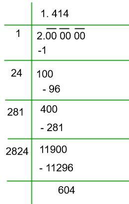 根據勾股定理,在邊長為一個單位的正方形中,對角線的長度在幾何上等於2的平方根。這可能是發現的第一個無理數。由於它的小數位數無限且無法表示為分數,因此根2是一個無理數。因此,無法計算根2的精確值。