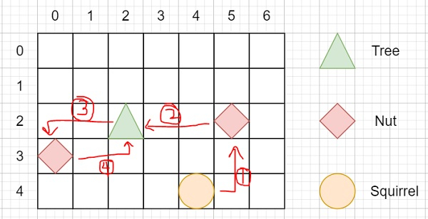 因此,如果輸入類似於高度:5 寬度:7 樹的位置:[2,2] 松鼠:[4,4] 堅果:[[3,0], [2,5]],則輸出將為 12。