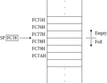 SP是一個特殊的16位暫存器。它包含一個記憶體地址。假設SP的內容為FC78H,則8085對其解釋如下: