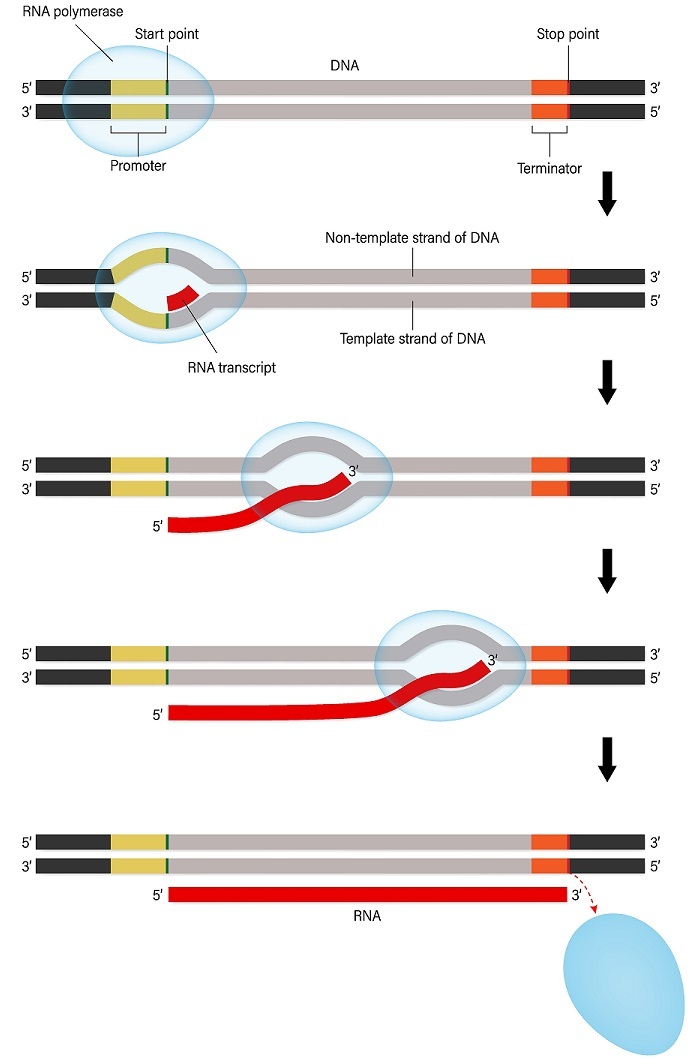 隨著RNA聚合酶沿著DNA移動,雙螺旋結構在其後重新形成,在酶前方形成新的解開的DNA片段。
