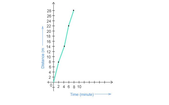 從A點出發,Paheli沿著如圖7所示的矩形路徑ABCD移動。她每走一段邊需要2分鐘。繪製距離-時間圖,並解釋運動是均勻的還是不均勻的。