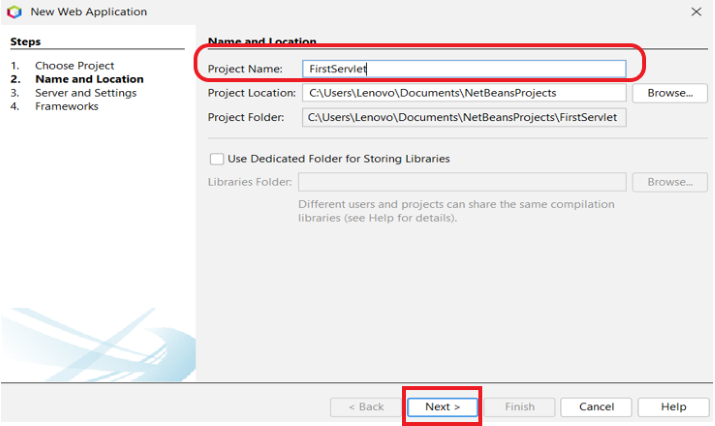 單擊下一步後,將開啟以下介面。現在,根據您的選擇提供專案名稱,然後單擊下一步。我們將其命名為“FirstServlet”。