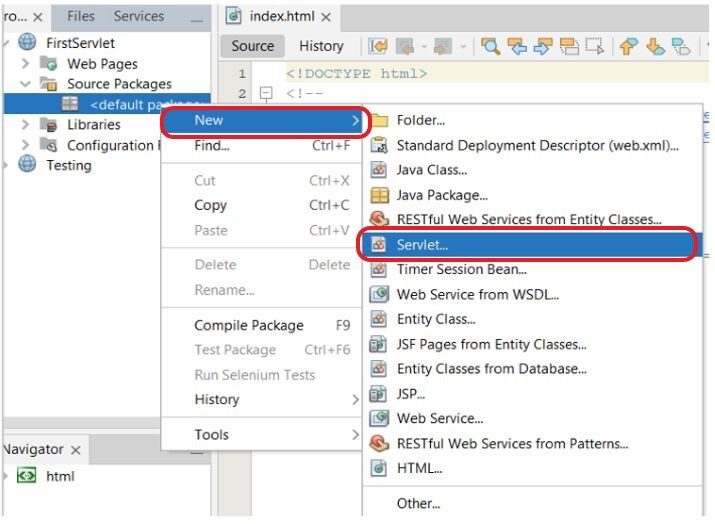現在,轉到源包資料夾,右鍵單擊預設包。然後單擊新建,然後單擊Servlet以建立一個新的 Servlet。