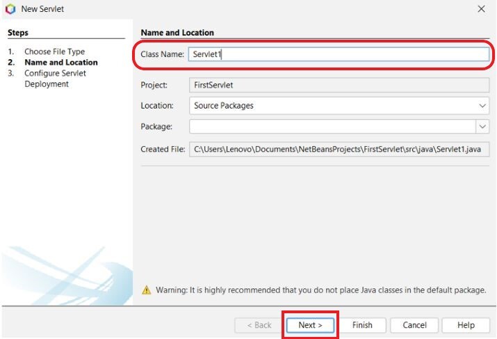 提供 Servlet 類名,然後單擊下一步。我們將其命名為“Servlet1”。