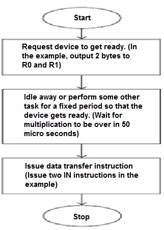 狀態檢查資料傳輸過程比簡單的資料傳輸複雜得多。我們使用這種方法是在缺乏關於包含時序特性的輸入輸出裝置的準確知識時使用。處理器接收關於輸入輸出裝置是否準備好執行資料傳輸的狀態資訊。通常,處理器會參與檢查迴圈,以使裝置準備好。當裝置準備好用於執行取決於需求的IN或OUT指令時,裝置會從迴圈中釋放出來。下面顯示的流程圖將幫助我們瞭解簡單輸入輸出過程的整個過程。