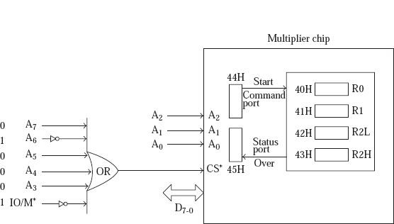 假設連線的晶片是作為I/O對映的輸入輸出的對映,如下圖所示。根據晶片選擇的電路,R0、R1、R2L、R2H、命令暫存器和狀態暫存器的地址分別為40H、41H、42H、43H、44H和45H。