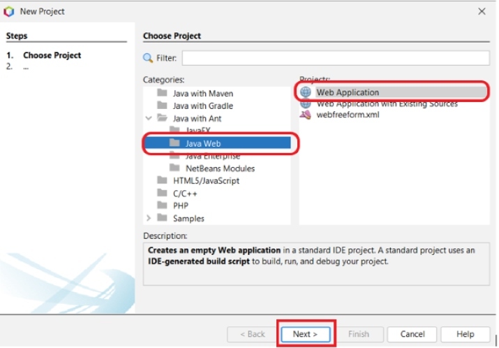 步驟 2 − 建立一個 Java 專案。為此,開啟您的 Netbeans IDE 並透過以下路徑建立一個新的 Java Web 應用程式:檔案→ 新建專案 → Java Web → Java Web 應用程式。
