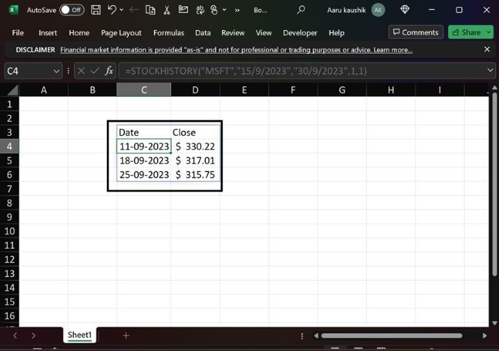 讓我們使用其他引數。使用者需要在同一單元格中編輯公式=STOCKHISTORY("MSFT","15/9/2023","30/9/2023",1,1),如下所示: