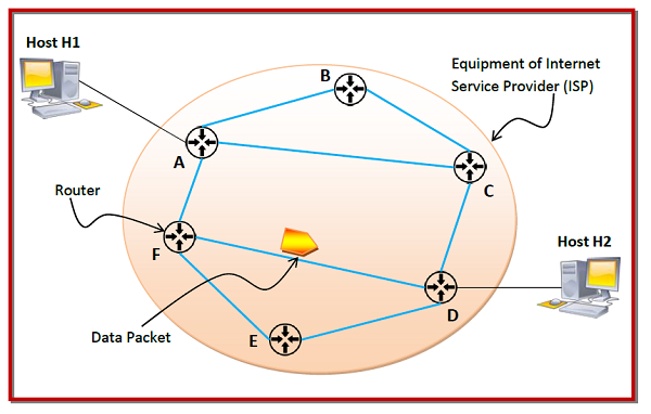 在上圖中,我們可以看到網際網路服務提供商 (ISP) 有六個路由器 (A 到 F) 透過藍色線條所示的傳輸線連線。有兩個主機,主機 H1 連線到路由器 A,而主機 H2 連線到路由器 D。假設 H1 想要向 H2 傳送資料分組。H1 將分組傳送到路由器 A。分組儲存在路由器 A 中,直到它完全到達。路由器 A 使用 CRC (迴圈冗餘校驗) 程式碼驗證校驗和。如果存在 CRC 錯誤,則丟棄分組,否則將其傳輸到下一個跳,此處為路由器 F。路由器 F 遵循相同的過程,然後將分組傳輸到路由器 D。最後,路由器 D 將分組傳遞給主機 H2。