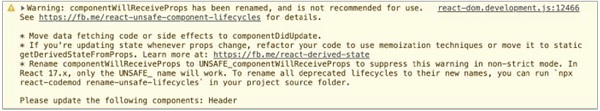 如果我們使用 React 的已棄用的類元件,如 componentWillReceiveProps,那麼它將顯示以下警告。