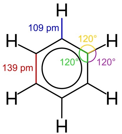 總共有“六個p軌道電子”可以構建“電子雲”,穩定“芳香環”的上下方。碳原子以“六元環”的形式排列,並分別連線一個“氫原子”。苯的結構中,C-C鍵鍵角為120°。