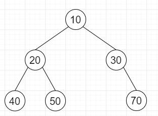 root->left = new TreeNode(20); root->right = new TreeNode(30); root->left->left = new TreeNode(40); root->left->right = new TreeNode(50); root->right->right = new TreeNode(70);