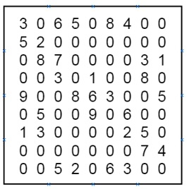 {3, 0, 6, 5, 0, 8, 4, 0, 0},