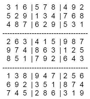 3 1 6 | 5 7 8 | 4 9 2 5 2 9 | 1 3 4 | 7 6 8 4 8 7 | 6 2 9 | 5 3 1 --------------------------- 2 6 3 | 4 1 5 | 9 8 7 9 7 4 | 8 6 3 | 1 2 5 8 5 1 | 7 9 2 | 6 4 3 --------------------------- 1 3 8 | 9 4 7 | 2 5 6 6 9 2 | 3 5 1 | 8 7 4 7 4 5 | 2 8 6 | 3 1 9
