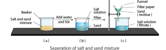 (c) 過濾可用於分離鹽溶液(鹽和水)和沙子。蒸發鹽溶液將使鹽與溶液分離。
