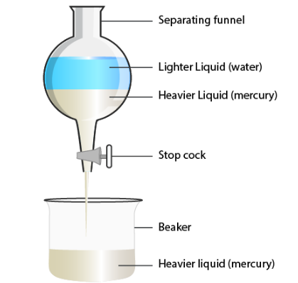 使用分液漏斗分離兩種不互溶的液體。汞和水的混合物形成兩層,因為它們彼此完全不溶。