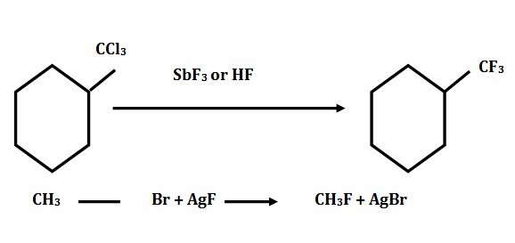 Swarts反應通常用於由烷基氯化物製備烷基氟化物。Swarts反應過程主要涉及在含有某些重金屬的氟化物存在下,對烷基氯化物進行加熱。此方法的例子包括$\mathrm{AgF\:,\:HgF_{2}}$以及$\mathrm{CoF_{2}}$,並且在這個反應中,丙酮通常用作溶劑以提高反應速率。